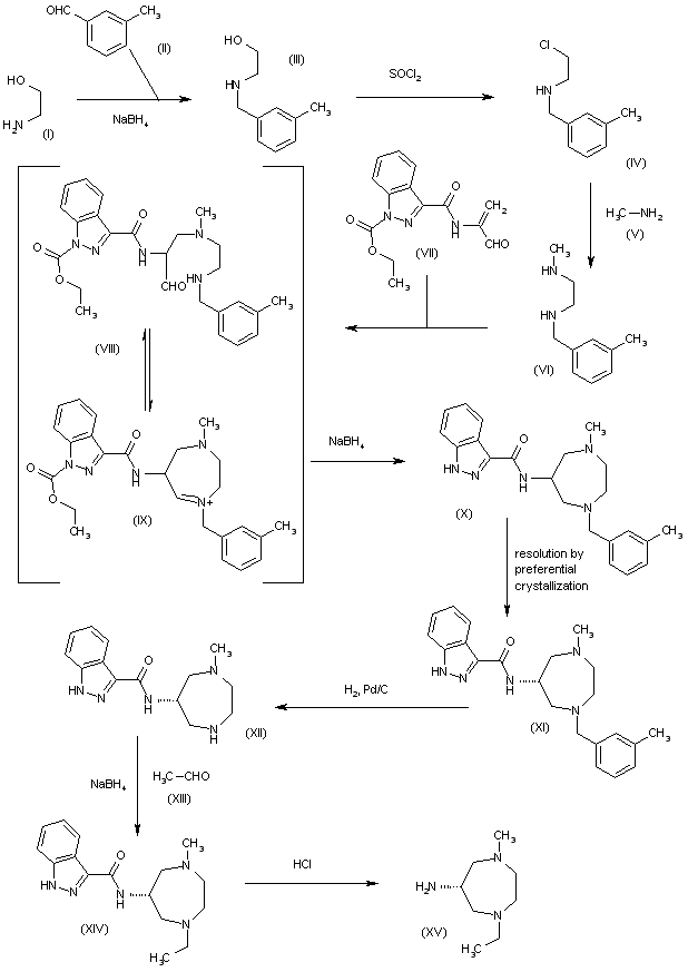 The reductocondensation of ethanolamine (I) with 3-methylbenzaldehyde (II) by means of NaBH4 gives N-(3-methylbenzyl)ethanolamine (III), which is treated with SOCl2 to yield the 2-chloroethyl derivative (IV). The reaction of (IV) with methylamine (V) affords N-methyl-N'-(3-methylbenzyl)ethane-1,2-diamine (VI), which is condensed with the pyrazole-carboxamide derivative (VII) to provide the unstable compound (VIII)?? (IX). The reduction of (IX) with NaBH4 gives the racemic amide (X), which is submitted to optical resolution by preferential crystallization to yield the (R)-isomer (XI) (1,2). The hydrogenation of (XI) with H2 over Pd/C in ethanol affords the debenzylated compound (XII), which is alkylated by reductocondensation with acetaldehyde (XIII) and NaBH4 in methanol to provide the chiral N-(1-ethyl-4'-methylperhydro-1,4-diazepin-6-(R)-yl)-1H-pyrazole-3-carboxamide (XIV). Finally, this compound is treated with refluxing aqueous HCl to give the corresponding 6(R)-amino derivative (XV).