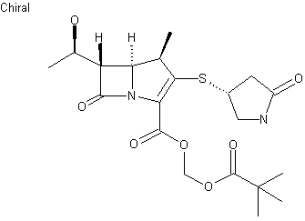 1) The mesylation of 4(S)-hydroxypyrrolidin-2-one (I) with mesyl chloride and triethylamine in pyridine gives the corresponding ester (II), which is treated with potassium thioacetate (III) in refluxing acetonitrile yielding 4(R)-(acetylsulfanyl)pyrrolidin-2-one (IV). The hydrolysis of (IV) with sodium methoxide in methanol followed by acidification with aqueous HCl affords 4(R)-sulfanylpyrrolidin-2-one (V), which is condensed with (1R,5S,6S)-2-(diphenoxyphosphoryloxy)-6-[1(R)-hydroxyethyl]-1-methyl-1-carba-2-penem-3-carboxylic acid p-nitrobenzyl ester (VI) by means of ethyldiisopropylamine in acetonitrile to give (1R,5S,6S)-6-[1(R)-hydroxyethyl]-1-methyl-2-[5-oxopyrrolidin-3(R)-ylsulfanyl]-1-carba-2-penem-3-carboxylic acid p-nitrobenzyl ester (VII). The hydrogenolysis of (VII) with H2 over Pd/C in THF/aqueous phosphate buffer yields the sodium salt (VIII), which is finally esterified with pivaloyloxymethyl iodide (IX) in dimethylacetamide.