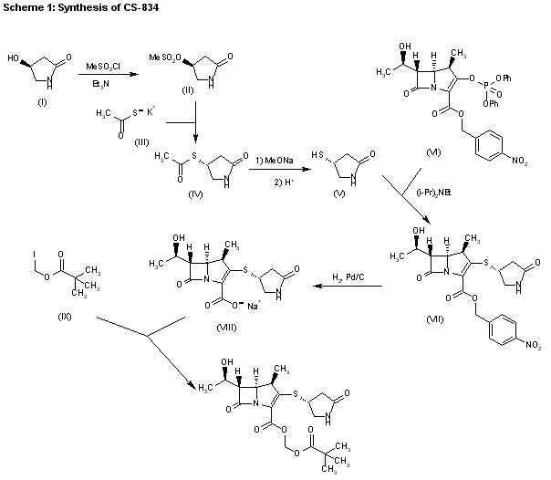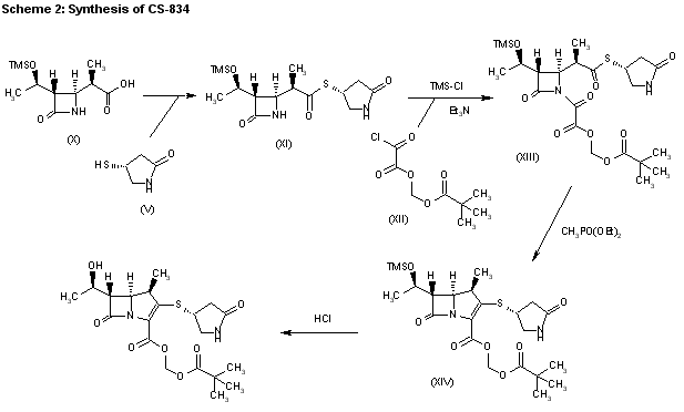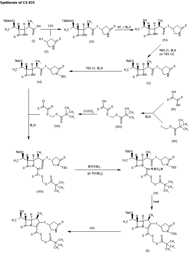 A short-step synthesis of CS-834 has been described: The condensation of azetidinone (I) with pyrrolidinone (II) by means of CDI gives the thioester (III), which is desilylated with BF3/Et2O to the alcohol (IV). In order to have a more labile protecting group, alcohol (IV) is resilylated with TMS-Cl (or TES-Cl) and triethylamine affording the silyl ether (V), which is protected again at the pyrrolidine nitrogen with TES-Cl, affording the disilylated azetidinone (VI). The condensation of (VI) with the oxalyl chloride (VII) by means of triethylamine in dichloromethane gives the expected oxalylazetidinone (VIII), which is treated with diethyl ethylphosphonite in toluene yielding the ylide (IX). This compound, without isolation, is cyclized in refluxing mesitylene to afford the protected carbapenem intermediate (X), which is finally desilylated with HCl in acetonitrile. The cyclization of azetidinone (VIII) to carbapenem (X) can also be performed with triethyl phosphite instead of diethyl ethylphosphonite. The oxalyl chloride (VII) is obtained by monoesterification of oxalic acid (XI) with pivaloyloxymethyl iodide (XII) by means of triethylamine yielding monoester (XIII), which is finally converted to intermediate (VII) by treatment with oxalyl chloride in dichloromethane.