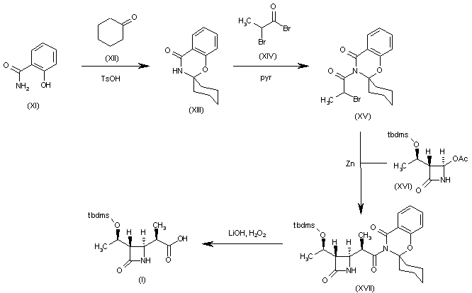 The reaction of 2-hydroxybenzamide (XI) with cyclohexanone (XII) by means of Ts-OH in toluene gives the spiranic benzoxazine (XIII), which is condensed with 2-bromopropionyl bromide (XIV) by means of pyridine in toluene, yielding the corresponding acylated benzoxazine (XV). The condensation of (XV) with chiral azetidinone (XVI) by means of Zn in refluxing THF affords the adduct (XVII), which is finally hydrolyzed with LiOH and H2O2 to furnish the target azetidinonepropionic acid (I).
