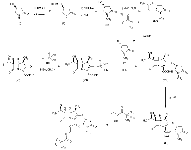 Protection of alcohol (I) with TBDMSCl and imidazole gives silyl compound (II) which is N-methylated by means of NaH and MeI and then deprotected with HCl to yield derivative (III). Mesylation of (III) with MsCl in presence of Et3N followed by thioacetylation with AcSK (A) affords thioacetate (IV) which is then hydrolyzed with NaOMe to yield (V). Treatment of (VI) with diphenylphosphoryl chloride (B) and DIEA in acetonitrile yields (VII), which is then condensed with mercaptan (V) by means of DIEA in the same solvent to provide carbapenem (VIII). Deprotection of the carboxyl moiety of (VIII) by hydrogenation with H2 over Pd/C affords carboxylate (IX), which is finally esterified with pivaloyloxymethyl iodide (X) in N,N-dimethylacetamide or DMF.