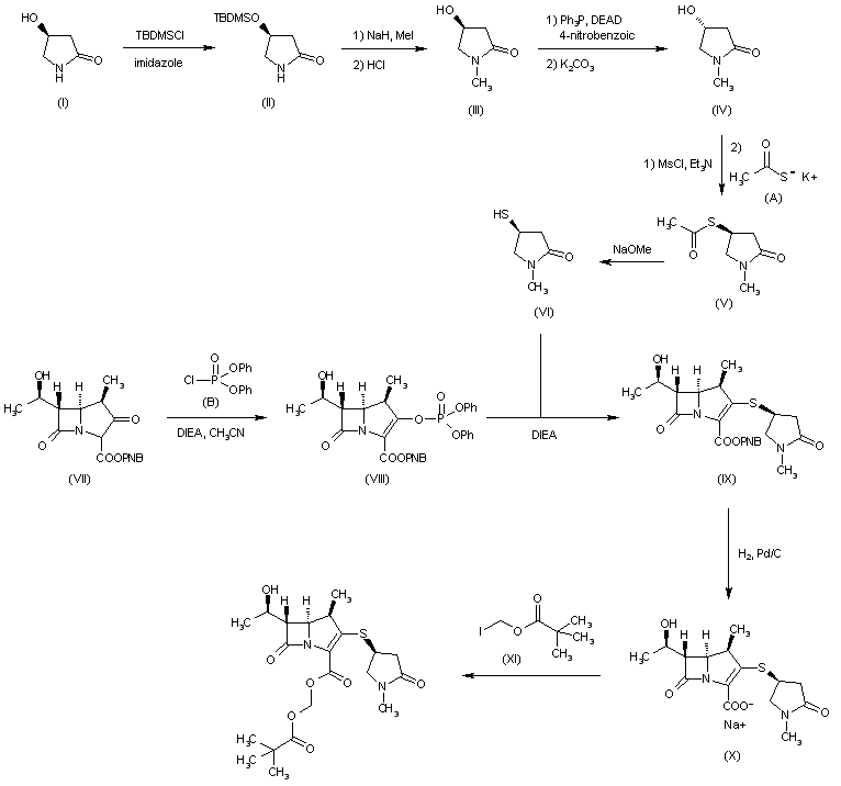 Alcohol (I) is protected with TBDMSCl and imidazole to give silyl compound (II), which is N-methylated by means of NaH and MeI and then deprotected with HCl to yield derivative (III). Mitsunobu reaction of (III) with 4-nitrobenzoic acid in presence of PPh3 and DEAD, followed by ester hydrolysis with K2CO3, provides alcohol (IV). Mesylation of (IV) with MsCl in presence of Et3N, followed by thioacetylation with AcSK (A), affords thioacetate (V), which is then hydrolyzed with NaOMe to yield (VI). Treatment of (VII) with diphenylphosphoryl chloride (B) in CH3CN and DIEA in CH3CN yields (VIII), which is then condensed with mercaptan (VI) by means of DIEA in the same solvent to provide carbapenem (IX). Deprotection of the carboxyl moiety of (IX) by hydrogenation with H2 over Pd/C affords carboxylate (X), which is finally esterified with pivaloyloxymethyl iodide (XI) in N,N-dimethylacetamide or DMF.