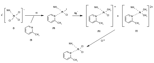 AMD473 is prepared by a modified Dhara synthesis: The procedure is similar to that described for the preparation of the platinum(II) precursor of the other mixed amine platinum drug currently in development, JM216. In the first step, potassium amminetrichloroplatinate (II) is reacted with 2-picoline in the presence of iodide at ambient temperature. The direction of substitution in platinum(II) complexes is controlled by the trans effect of the different ligands. Since in [PtCl3(NH3)] the trans effect for Cl > NH3, one of the trans pair of chloride ligands is initially substituted by iodide. Iodide has a much greater trans effect than chloride or ammine ligands and directs further substitution trans to itself. Binding of 2-picoline results in precipitation of the desired isomer [PtCl(I)(NH3)(2-picoline)]. In the second step, the iodide ligand is removed by reaction with silver ions in water at ambient temperature and treatment of the resulting aqua platinum complexes with chloride yields [PtCl2(NH3)(2-picoline)]. This occurs with retention of stereochemistry at platinum, so yielding the pure cis isomer. This complex may be recrystallized from dilute hydrochloric acid.