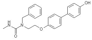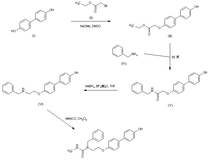 The alkylation of 4,4'-dihydroxybiphenyl (I) with ethyl bromoacetate (II) in the presence of sodium methoxide afforded the (biphenylyloxy)acetate (III). Heating of ester (III) with benzylamine (IV) at 85 C produced amide (V), which was subsequently reduced to amine (VI) by means of borane, generated in situ from NaBH4 and BF3. Finally, condensation of the secondary amine (VI) with methyl isocyanate gave rise to the title urea derivative.