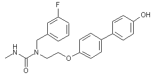 The alkylation of 4,4'-dihydroxybiphenyl (I) with ethyl bromoacetate (II) in the presence of sodium methoxide afforded the (biphenylyloxy)acetate (III). Heating of ester (III) with m-fluorobenzylamine (IV) at 85 C produced amide (V), which was subsequently reduced to amine (VI) by means of borane, generated in situ from NaBH4 and BF3. Finally, condensation of the secondary amine (VI) with methyl isocyanate gave rise to the title urea derivative.