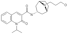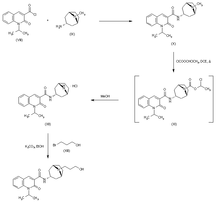 Condensation of acid chloride (VIII) 3-aminotropane (IX) provided amide (X). N-Demethylation of (X) was then achieved by treatment with 1-chloroethyl chloroformate, followed by hydrolysis and decarboxylation of the intermediate carbamate (XI) with MeOH. The resulting secondary amine (XII) was then alkylated with 3-bromopropanol (XIII) to afford the target hydroxypropyl derivative.