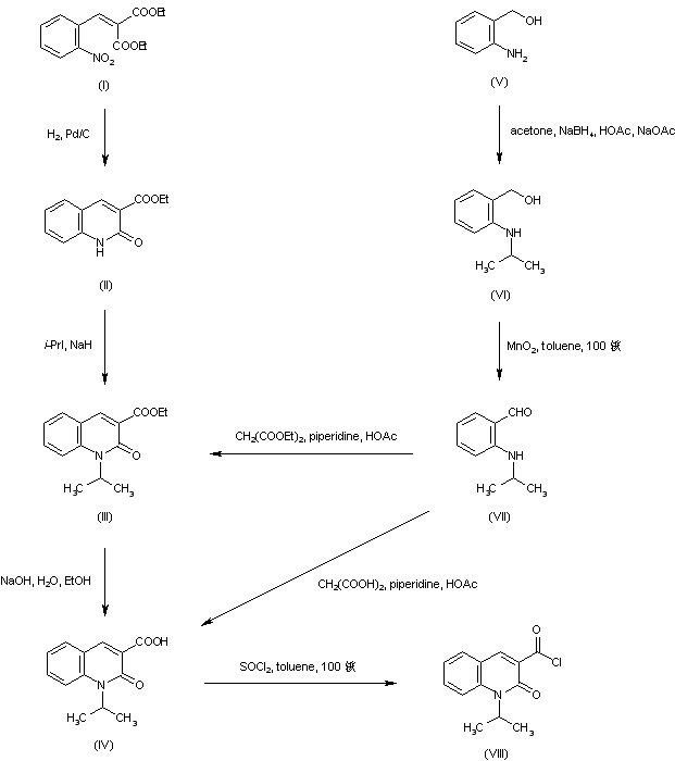 Reductive ring closure of diethyl 2-nitrobenzylidenemalonate (I) afforded quinolone (II). Subsequent N-alkylation of (II) with isopropyl iodide gave (III). Carboxylic acid (IV) was then obtained by basic hydrolysis of the ethyl ester (III). In a related procedure, reductive alkylation of 2-aminobenzyl alcohol (V) with acetone in the presence of NaBH4 gave the N-isopropyl derivative (VI). Oxidation of (VI) using activated MnO2 in toluene yielded aldehyde (VII). Further Knoevenagel condensation of (VII) with diethyl malonate in the presence of piperidine and AcOH produced the previously described quinolone ester (III). Alternatively, condensation of (VII) with malonic acid directly produced the previously described quinolonecarboxylic acid (IV). Acid chloride (VIII) was then prepared by treatment of (IV) with thionyl chloride in hot toluene.
