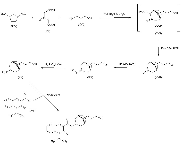 Condensation between 2,5-dimethoxytetrahydrofuran (XIV), acetone-1,3-dicarboxylic acid (XV) and 3-amino-1-propanol (XVI), followed by acid decarboxylation of the intermediate adduct (XVII) furnished the tropinone analogue (XVIII). After conversion of (XVIII) to the corresponding oxime (XIX), its hydrogenation over PtO2 gave amine (XX). This was finally coupled with acid chloride (VIII) to give the title amide.