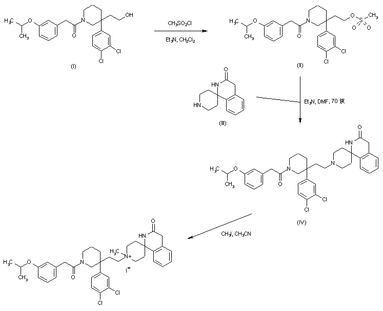 The known piperidinoethanol derivative (I) was converted to the mesylate (II) upon treatment with methanesulfonyl chloride and triethylamine. Displacement of the mesylate group of (II) with the spiro-substituted piperidine (III) provided adduct (IV). Finally, quaternization of piperidine (IV) with iodomethane gave the corresponding ammonium salt as a mixture of cis/trans isomers that were separated by column chromatography.