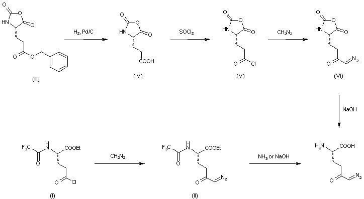 Compound can be prepared in two different ways: 1) The reaction of N-trifluoroacetyl-L-glutamic acid 1-ethyl ester-5-acid chloride (I) with diazomethane in ether gives 6-diazo-5-oxonorleucine ethyl ester (II), which can be hydrolyzed by treatment with ammonia or NaOH in ethanol water. 2) The hydrogenation of gamma-benzyl ester of N-carboxy-L-glutamate anhydride (III) with H2 over Pd/C in ethyl acetate gives N-carboxy-L-glutamate anhydride (IV), which by reaction with refluxing SOCl2 yields L-4-[2-(chlorocarbonyl)ethyl]oxazolidine-2,5-dione (V). The reaction of (V) with diazomethane in ether affords L-4-(4-diazo-3-oxobutyl)oxazolidine-2,5-dione (VI), which is finally hydrolyzed with NaOH in water at room temperature.
