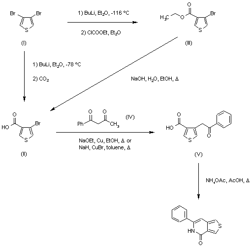 The intermediate 4-bromothiophene-3-carboxylic acid (II) was prepared in low yield by lithium-halogen exchange of 3,4-dibromothiophene (I) with n-BuLi in Et2O at -78 C, followed by quenching with solid CO2. Alternatively, lithiation of (I) at -116 C and further quenching with ethyl chloroformate provided ethyl ester (III) in moderate yields, accompanied by some byproducts that were separated by column chromatography. The required carboxylic acid (II) was then formed by saponification of (III) with NaOH. Subsequent condensation of bromoacid (II) with acetylacetone (IV) in the presence of potassium tert-butoxide and copper powder in refluxing tert-butanol provided the thienylpentanedione (V). Deacetylation with aqueous ammonia then gave the monoketone (VI). The target thienopyridinone was finally obtained by cyclization of (VI) with ammonium acetate in refluxing AcOH.