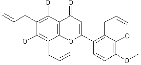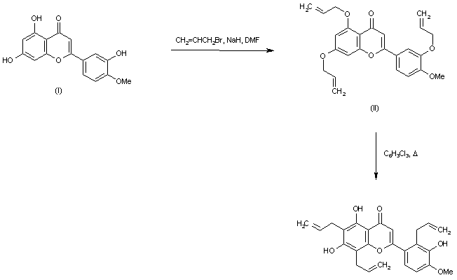 The alkylation of diosmetin (I) with allyl bromide in the presence of NaH in DMF furnished the triallyl ether (II). Claisen rearrangement of (II) in refluxing trichlorobenzene then gave the title compound.