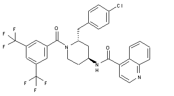 | 合成路线图解说明: Alkylation of methyl [1-(4-chlorobenzyl)but-3-enyl]carbamate (I) with chloromethyl ethyl ether in the presence of NaH afforded carbamate (II). Cyclization of (II) using chlorosulfonic acid in acetonitrile gave the trans-acetylamino piperidine (III). After removal of the carbamate group of (III) with HBr in HOAc, the racemic piperidine (IV) was resolved by acylation with (S)-O-acetylmandelic acid chloride (V), followed by recrystallization of the desired diastereoisomer (VI). Hydrolysis of (VI) with aqueous HCl furnished the chiral amino piperidine (VII), which was selectively protected with benzaldehyde (VIII) at the primary amino group as the corresponding benzaldimine (IX). Condensation of piperidine (IX) with 3,5-bis(trifluoromethyl)benzoyl chloride (X) followed by acid hydrolysis of the benzaldimine function produced the amino amide (XI). This was finally coupled with quinoline-4-carbonyl chloride (XII), yielding the title compound. |