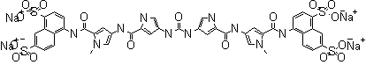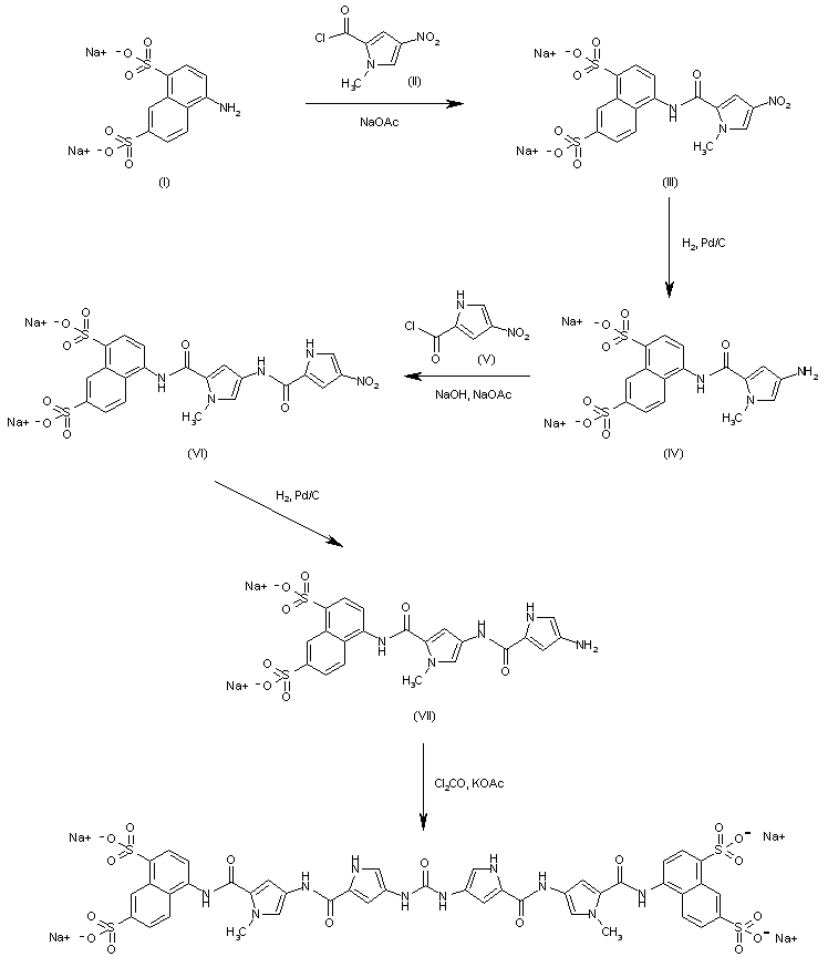 The reaction of 4-aminonaphthalene-1,7-disulfonic acid disodium salt (I) with 1-methyl-4-nitropyrrole-2-carbonyl chloride (II) by means of NaOAc in water gives the corresponding nitro-amide (III), which is reduced with H2 over Pd/C in water to the amino-amide (IV). The reaction of (IV) with 4-nitropyrrole-2-carbonyl chloride (V) by means of NaOH and NaOAc yields the nitro-diamide (VI), which is reduced with H2 over Pd/C as before affording the amino-diamide (VII). Finally, this compound is dimerized by reaction with phosgene and KOAc in dioxane/water.