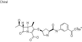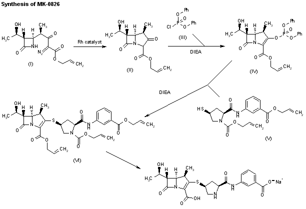 MK-0826 can be synthesized as follows: The cyclization of 2-diazo-4-[3-(1-hydroxyethyl)-4-oxoazetidin-2-yl]-3-oxopentanoic acid allyl ester (I) by means of rhodium octanoate gives the 2-oxocarbapenam derivative (II), which by reaction with chlorophosphoric acid diphenyl ester (III) and DIEA in acetonitrile yields the enol phosphate (IV). Condensation of (IV) with the sulfanylpyrrolidine (V) by means of DIEA in acetonitrile affords the corresponding addition compound MK-0826 diallyl ester (VI), which is finally deprotected by means of Meldrum's acid and Pd(PPh3)4 in DMF/THF and converted to the sodium salt.