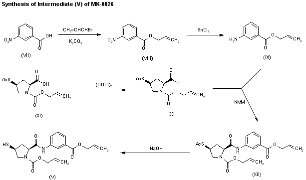The sulfanylpyrrolidine (V) can be obtained as follows: Esterification of 3-nitrobenzoic acid (VII) with allyl bromide and K2CO3 in DMF gives the corresponding allyl ester (VIII), which is reduced with SnCl2 in refluxing ethyl acetate to yield the 3-aminobenzoate (IX). The condensation of (IX) with the pyrrolidinecarbonyl chloride (X), obtained from the corresponding carboxylic acid (XI) and oxalyl chloride, by means of NMM in dichloro-methane affords the expected amide (XII), which is finally deacetylated with NaOH in allyl alcohol.