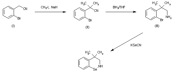 The methylation of 2-(2-bromophenyl)acetonitrile (I) with Me-I and NaH in THF gives 2-(2-bromophenyl)-2-methylpropionitrile (II), which is reduced with BH3/THF to yield 2-(2-bromophenyl)-2-methylpropylamine (III) (1). Finally, this compound is cyclized with potassium selenocyanate in DMF to afford the target 1,2-benzoselenazine.