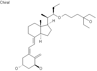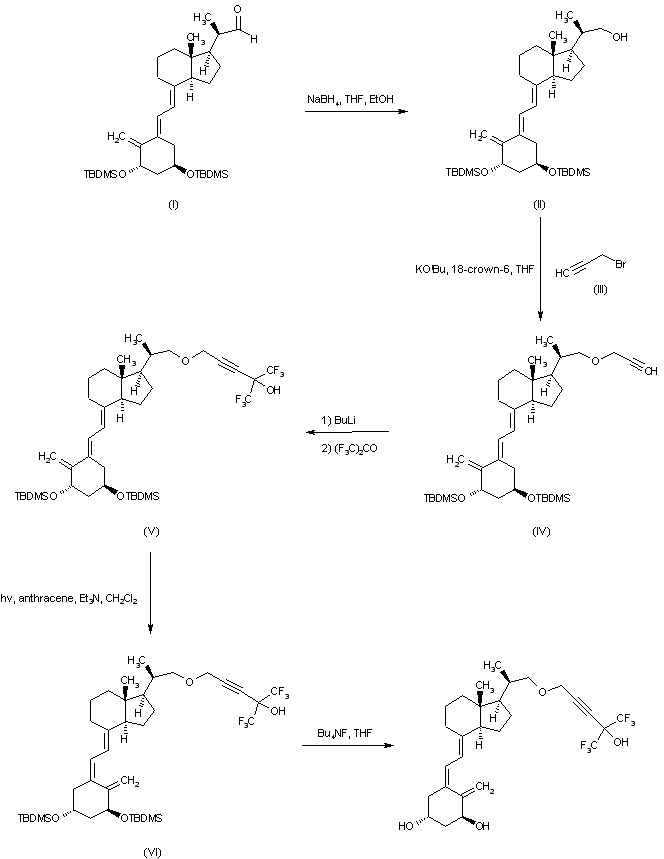 Reduction of vitamin D derivative (I) with NaBH4 in ethanol-THF affords alcohol (II), which is alkylated with propargyl bromide (III) and potassium tert-butoxide in the presence of a crown ether. The resulting propargyl ether (IV) is condensed with hexafluoroacetone, by means of butyl litium, to provide tertiary alcohol (V). This compound is then photochemically isomerized in the presence of anthracene as a sensitizer to give (VI). Final deprotection of TBDMS groups with tetrabutylammonium fluoride in THF yields the title compound.