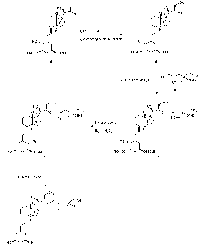 Vitamin D derivative (I) was condensed with ethyllithium al low temperature to give, after chromatographic separation of isomers, alcohol (II). Alkylation of (II) with 6-bromo-3-ethyl-3-(trimethylsilyloxy)hexane (III) and potassium tert-butoxide in the presence of a crown ether afforded ether (IV), which was then photochemically isomerized in the presence of anthracene as a sensitizer to give (V). Final deprotection of silyl groups of (V) with 5% hydrogen fluoride in ethyl acetate-acetonitrile yielded the title compound.