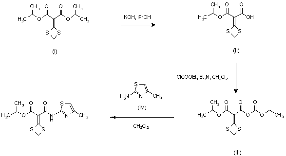 Partial hydrolysis of diisopropyl ester (I) with KOH at room temperature gives the monoacid (II). Treatment of this acid with ethyl chloroformate in the presence of triethylamine affords the mixed anhydride (III), which is then condensed with 2-amino-4-methylthiazole (IV).