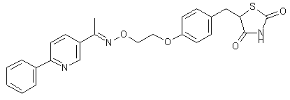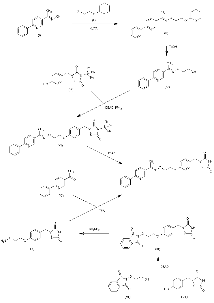 This compound has been obtained by two related ways: 1) The condensation of 3-acetyl-6-phenylpyridine oxime (I) with 2-(2-bromoethoxy)tetrahydropyran (II) by means of K2CO3 in hot dimethylacetamide gives the oxime derivative (III), which is treated with TsOH in methanol yielding 3-acetyl-6-phenylpyridine O-(2-hydroxyethyl)oxime (IV). The condensation of (IV) with 5-(4-hydroxybenzyl)-3-tritylthiazolidine-2,4-dione (V) by means of diethyl azodicarboxylate (DEAD) and PPh3 in THF affords (VI), the trityl derivative of the target compound, which is finally treated with hot aqueous ethanol to eliminate the trityl group. 2) The condensation of 5-(4-hydroxybenzyl)thiazolidine-2,4-dione (VIII) with N-(2-hydroxyethoxy)phthalimide (VII) by means DEAD gives the adduct (IX), which is treated with hydrazine to eliminate the phthalimido group yielding the substituted hydroxylamine (X). Finally, this compound is condensed with 3-acetyl-6-phenylpyridine (XI) by means of TEA.