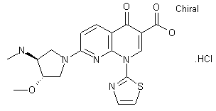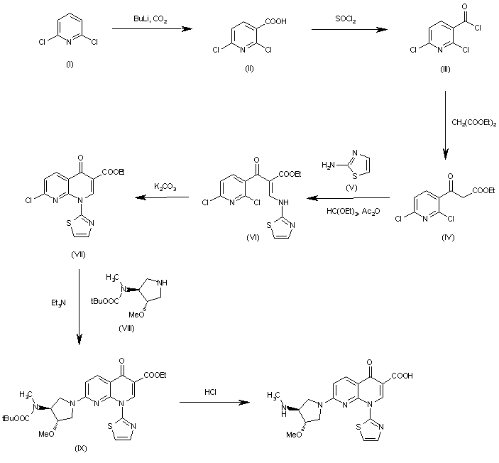 The reaction of 2,6-dichloropyridine (I) with BuLi and CO2 in THF gives 2,6-dichloropyridine-3-carboxylic acid (II) (1), which by reaction with refluxing SOCl2 yields the acyl chloride (III). The reaction of (III) with malonic ester by means of magnesium ethoxide in ethyl ether affords the nicotinoylacetic ester (IV), which is condensed with thiazol-2-amine (V) and triethylorthoformate by means of acetic anhydride providing the nicotinoyl acrylate (VI). The cyclization of (VI) by means of K2CO3 in hot dioxane gives the 7-chloro-4-oxo-1-(2-thiazolyl)-1,4-dihydro-1,8-naphthyridine-3-carboxylic acid ethyl ester (VII), which is condensed with the chiral pyrrolidine (VIII) by means of triethylamine yielding the proteted intermediate (IX). Finally, this compound is deprotected and hydrolyzed with hot aqueous HCl.