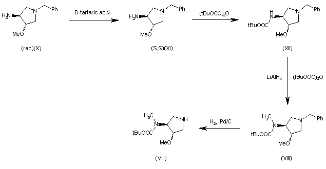 The chiral intermediate, the pyrrolidine (VIII) has been obtained as follows: The optical resolution of (trans)-3-amino-1-benzyl-4-methoxypyrroloidine (rac)-(X) with D-tartaric acid gives the enathiomer (S,S)(XI), which is treated with tert-butoxycarbonyl anhydride in methanol to yield the carbamate (XII). The reduction of (XII) with LiAlH4 in THF followed by reprotection with tert-butoxycarbonyl anhydride in dichloromethane affords (S,S)-1-benzyl-3-[N-(tert-butoxycarbonyl)-N-methylamino]-4-methoxypyrrolidine (XIII), which is finally debenzylated to the target compound (VIII) by hydrogenation with H2 over Pd/C in ethanol.