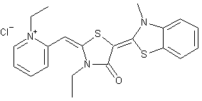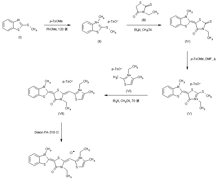 N-Methylation of 2-(methylsulfanyl)benzothiazole (I) using methyl p-toluenesulfonate afforded iminium salt (II), which was condensed with 3-ethyl-4-oxothiazolidine-2-thione (III) to give the benzothiazolinylidene dervative (IV). Subsequent S-methylation of (IV) to produce the 3-ethyl-2-(methylthio)thiazolinium salt (V) was followed by condensation with 2,4-dimethyl-3-ethylthiazolium salt (VI) in the presence of Et3N, yielding the triheterocyclic system (VIII) as the p-toluenesulfonate salt. Finally, conversion to the title chloride salt was achieved by means of an anionic exchange resin.