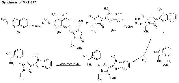 The alkylation of 2-(methylsulfanyl)benzothiazole (I) with methyl p-toluenesulfonate in anisole gives 3-methyl-2-(methylsulfanyl)benzothiazolium p-toluenesulfonate (II), which is condensed with 3-ethyl-2-thioxothiazolidin-4-one (III) by means of triethylamine in acetonitrile to yield 3-ethyl-5-(3-methyl-2,3-dihydrobenzothiazol-2-ylidene)-2-thioxothiazolidin-4-one (IV). The methylation of (IV) with methyl p-toluenesulfonate in DMF affords 3-ethyl-5-(3-methyl-2,3-dihydrobenzothiazol-2-ylidene)-2-(methylsulfanyl)-4-oxo-4,5-dihydrothiazolium p-toluenesulfonate (V) (1), which is condensed with 1-ethyl-2-methylpyridinium p-toluenesulfonate (VI) by means of triethylamine in warm acetonitrile giving the p-toluenesulfonate of MKT-077 (VII). Finally, this compound is passed through an ion-exchange resin (Amberlyst A-26) in methanol/chloroform.