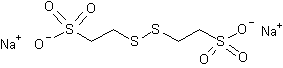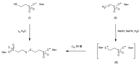 Oxidation of an aqueous solution of sodium 2-mercaptoethanesulfonate (I) with I2 provided the title disulfide. In a related procedure, addition of sodium hydrosulfide to the sodium salt of vinylsulfonic acid (II) gave intermediate (III) which, without isolation, was oxidized with O2 at 60 C under pressure.