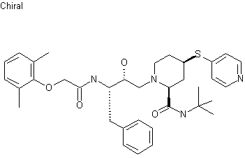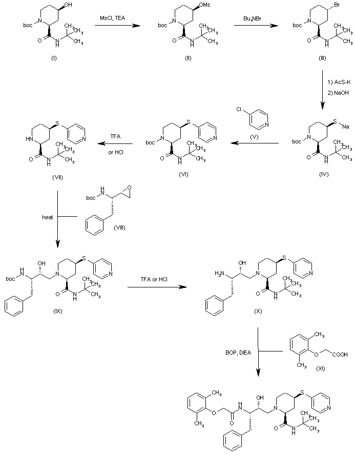 The reaction of (2S,4R)-1-(tert-butoxycarbonyl)-N-tert-butyl-4-hydroxypiperidine-2-carboxamide (I) with MsCl and TEA gives the mesylate (II), which is treated with tetrabutylammonium bromide in refluxing THF to yield the corresponding 4-bromo derivative (III). The reaction of (III) with potassium thioacetate, followed by hydrolysis with NaOH affords the sodium thiolate (IV), which is condensed with 4-chloropyridine (V) to provide (2S,4R)-1-(tert-butoxycarbonyl)-N-tert-butyl-4-(4-pyridylsulfanyl)piperidine-2-carboxamide (VI). The deprotection of (VI) with TFA or HCl in dioxane gives intermediate (VII), which is condensed with epoxide (VIII) in refluxing ethanol to obtain the expected addition compound (IX). The deprotection of (IX) with TFA or HCl as before yields the amide (X), which is finally condensed with 2-(2,6-dimethylphenoxy)acetic acid (XI) by means of BOP and DIEA to furnish the target diamide.