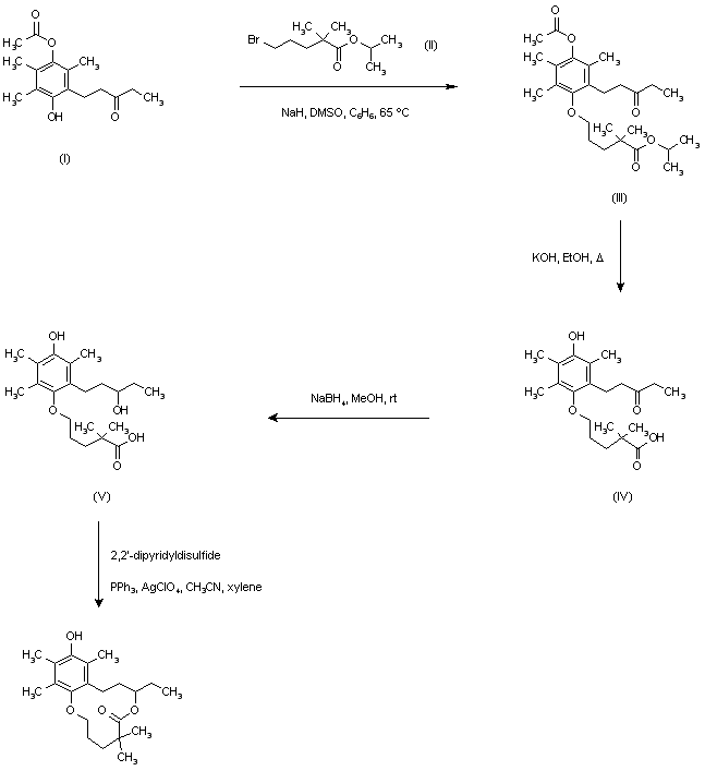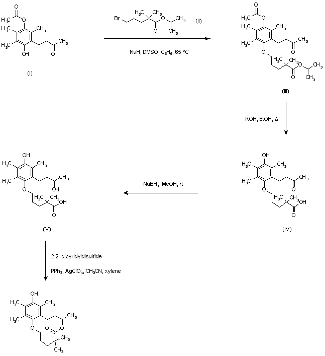 Arylbutanone (I), which was in equilibrium with its hemiacetal cyclic form, was alkylated with isopropyl 5-bromo-2,2-dimethyl-pentanoate (II) in the presence of NaH to afford ether (III). After saponification of the isopropyl and acetate esters of (III) with ethanolic KOH, the resulting ketoacid (IV) was reduced with NaBH4 to yield hydroxyacid (V). Finally, cyclization of (V) using 2,2'-dipyridyl disulfide, triphenylphosphine and silver perchlorate produced the target macrocyclic lactone.