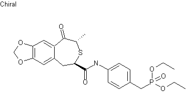 The diazonium salt prepared from 3,4-methylenedioxyaniline (I) was coupled to methyl acrylate (II) in the presence of Cu2O and HBr to produce the 2-bromo-3-phenylpropionic ester (III). Subsequent displacement of the bromo group of (III) by alpha-mercaptopropionic acid (IV) gave sulfide (V). After conversion of (V) to the corresponding acid chloride with (COCl)2, intramolecular Friedel-Crafts cyclization in the presence of SnCl4 afforded the benzothiepinone (VI) as a mixture of cis and trans isomers. Further treatment of this mixture with sodium methoxide equilibrated the mixture to the more stable trans form (VII). Resolution of the racemic trans ester was achieved by basic hydrolysis, coupling to ethyl (R)-(-)-mandelate (VIII), and fractional crystallization of the desired diastereomer (IX) from EtOAc-hexane. Ester hydrolysis of (IX) under acidic conditions led to the chiral carboxylic acid (X), which was finally condensed with diethyl 4-aminobenzylphosphonate (XI) to furnish the title compound.