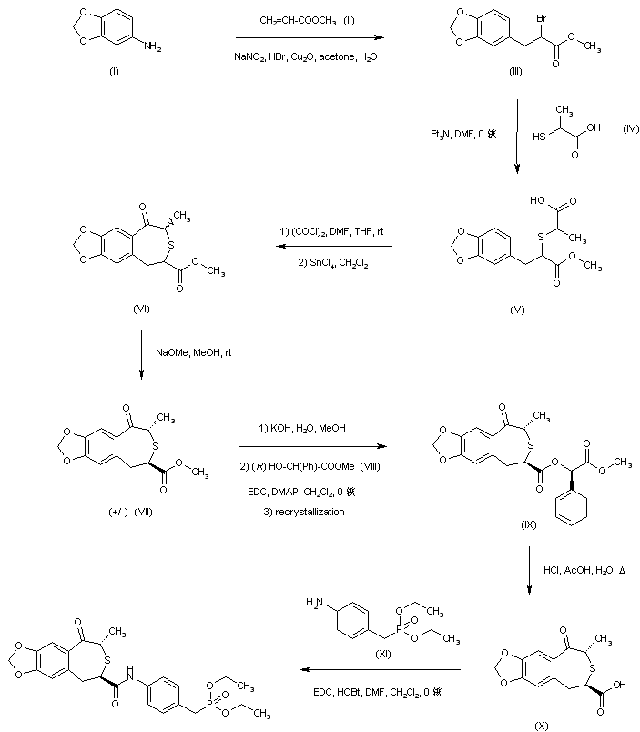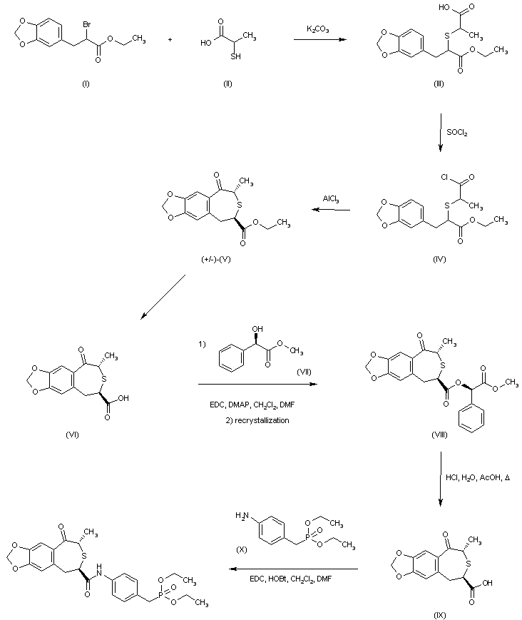 Condensation of halo ester (I) with 2-mercaptopropionic acid (II) provided thioether (III). After conversion of the carboxylic acid group of (III) into acid chloride (IV), Friedel-Crafts cyclization yielded the racemic trans benzothiepinone (V). Subsequent ester hydrolysis gave carboxylic acid (VI). The required (2R,4S) enantiomer (IX) was then isolated by condensation with methyl (R)-mandelate (VII), followed by recrystallization of the diastereoisomeric ester (VIII) from ethyl acetate-hexane, and further hydrolysis with HCl in AcOH. Finally, coupling of (IX) with diethyl 4-aminobenzylphosphonate (X) by means of EDC and HOBt furnished the title compound.