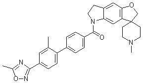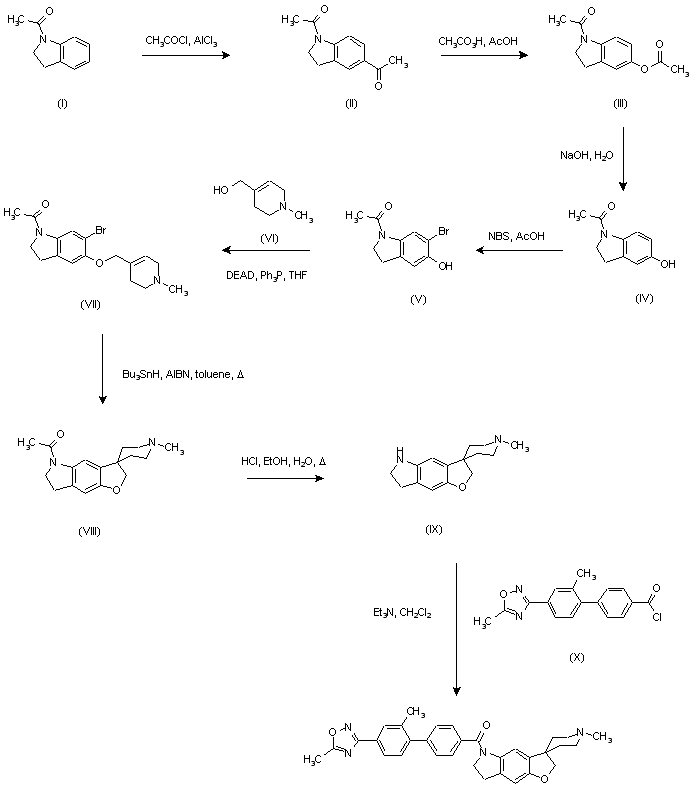 Friedel-Crafts acylation of 1-acetylindoline (I) with acetyl chloride and AlCl3 afforded ketone (II). Subsequent Baeyer-Villiger rearrangement using peracetic acid yielded acetate ester (III), which was hydrolyzed with NaOH to give phenol (IV). Bromination of (IV) with NBS in AcOH then provided bromo hydroxy indoline (V). Alkylation with 1-methyl-tetrahydropyridine-4-methanol (VI) under Mitsunobu conditions produced ether (VII). This was cyclized to the spirocyclic compound (VIII) using AIBN and tributyltin hydride in refluxing benzene. Then, amide hydrolysis in hydroalcoholic HCl gave (IX), which was finally condensed with acid chloride (X) to provide the desired amide.
