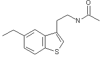 Thiol (II) was prepared by reduction of 4-ethylbenzenesulfonyl chloride (I) with LiAlH4. Subsequent alkylation of (II) with ethyl 4-chloroacetoacetate (III) provided sulfide (IV), which was cyclized to the required benzothiophene (V) on heating with polyphosphoric acid in toluene. Basic hydrolysis of the ester group of (V) gave carboxylic acid (IV). After conversion of (VI) to the corresponding acid chloride with SOCl2, treatment with NH4OH yielded amide (VII). This was dehydrated to nitrile (VIII) using trifluoroacetic anhydride and triethylamine. Reduction of the nitrile function of (VIII) by means of LiAlH4 and AlCl3 gave rise to the corresponding primary amine, which was isolated as the hydrochloride salt (IX). Finally, acylation with acetyl chloride furnished the title acetamide.