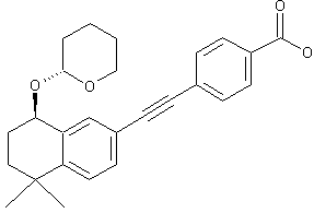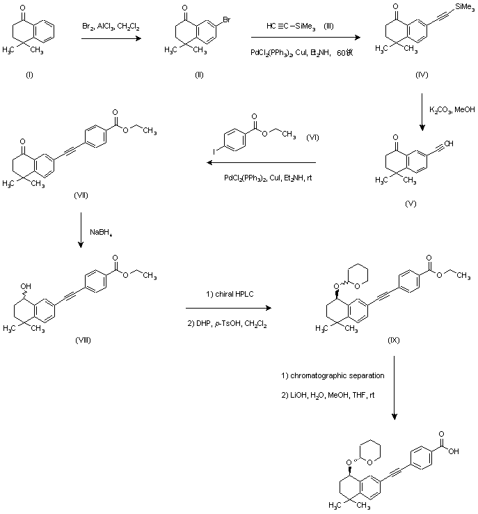 Bromination of tetralone (I) in the presence of AlCl3 provided (II), which was coupled with (trimethylsilyl)acetylene (III) using PdCl2(PPh3)2 and CuI as the catalysts yielding (IV). Removal of the protecting trimethylsilyl group from (IV) with K2CO3 in MeOH gave the arylacetylene (V), which was subjected to a second Pd-catalyzed coupling reaction with ethyl 4-iodobenzoate (VI) to furnish diarylacetylene (VII). Ketone group of (VII) was then reduced with NaBH4 to provide racemic alcohol (VIII), which was separated into the enantiomers employing chiral HPLC. Alternatively, enantioselective reduction using several chiral reducing agents furnished the enantiomerically enriched alcohols. The desired (R)-alcohol was condensed with dihydropyran in the presence of a catalytic amount of p-toluenesulfonic acid to yield a diastereomeric mixture of tetrahydropyranyl ethers (IX). After isolation by means of normal phase-HPLC, the (R,R)-isomer was finally hydrolyzed with LiOH to the target carboxylic acid.