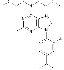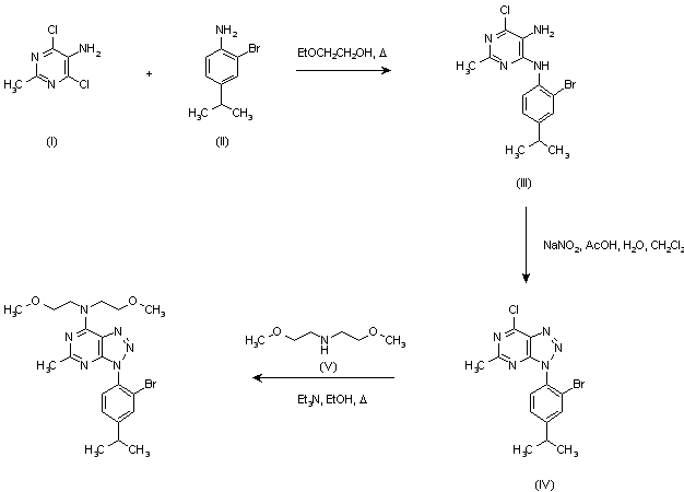 Condensation of 5-amino-4,6-dichloro-2-methylpyrimidine (I) and 2-bromo-4-isopropylaniline (II) in boiling ethoxyethanol gave diarylamine (III). Subsequent diazotization of (III) using NaNO2 and AcOH produced the triazolopyrimidine (IV), which was finally condensed with bis(2-methoxyethyl)amine (V) in the presence of Et3N in refluxing EtOH to provide the title compound.