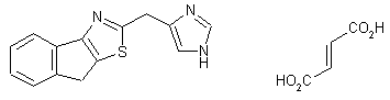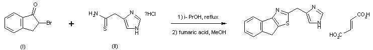The title compound is prepared by condensation between 2-bromo-1-indanone (I) and 2-(4-imidazolyl)thioacetamide hydrochloride (II) in refluxing isopropanol, followed by treatment with fumaric acid in MeOH.