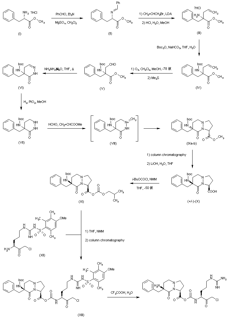 The reaction of phenylalanine methyl ester (I) with benzaldehyde (II) and TEA in dichloromethane gives the aldimine (III), which is condensed with allyl bromide (IV) by means of n-BuLi in THF yielding the adduct (V). Treatment of (V) with HCl in methanol cleaves the benzylidene protecting group to afford the alpha-allylphenylalanine methyl ester (VI), which is reprotected with Boc2O and NaHCO3 in THF providing the carbamate (VII). The ozonolysis of (VII) with O3 in MeOH/CH2Cl2 gives the aldehyde (VIII), which is cyclized with hydrazine in refluxing THF yielding the tetrahydropyridazinone (IX). Hydrogenation of (IX) with H2 over PtO2 in methanol affords the hexahydropyridazinone (X), which is cyclocondensed with ethyl acrylate (XI) and formaldehyde to furnish the pyrazolopyridazine (XII). Hydrolysis of the ester group of (XII) with LiOH in THF/water gives the acid (XIII), which is finally condensed with N-omega(4-methoxytrityl)-L-arginylchloromethane (XIV) by means of isobutyl chloroformate and NMM in THF yielding, after working up, a diastereomeric mixture of amides, from which the target diastereomer is obtained by column chromatography.