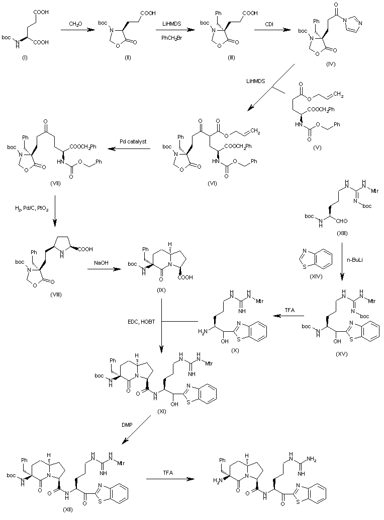 The cyclization of N-Boc-L-glutamic acid (I) with paraformaldehyde in refluxing DCE gives the oxazolidinone (II), which is benzylated with benzyl bromide and LiHMDS in THF yielding the benzyl derivative (III). The reaction of (II) with CDI in THF affords the activated acid (IV), which is condensed with the protected glutamic acid (V) by means of LiHMDS in THF to provide the adduct (VI). The decarboxylation of the allyloxycarbonyl group of (VI) by means of a Pd catalyst furnishes the compound (VII), which is deprotected and cyclized by hydrogenation with H2 over Pd/C and PtO2 to give the substituted proline (VIII). The lactam cyclization of (VIII) by means of NaOH in methanol, followed by crystallization yields the bicyclic carboxylic acid (IX), which is condensed with the arginine derivative (X) by means of EDC, HOBT and DIEA in THF affording the adduct (XI). The oxidation of the OH group of (XI) with DMP in dichloromethane gives the precursor (XII), which is finally deprotected by a treatment with TFA and PhS-Me. The intermediate arginine derivative (X) has been obtained as follows: The condensation of the fully protected arginine aldehyde derivative (XIII) with benzothiazole (XIV) by means of n-BuLi in ethyl ether gives the adduct (XV), which is then treated with TFA in order to eliminate the Boc protecting groups and furnish the desired arginine derivative intermediate (X).
