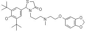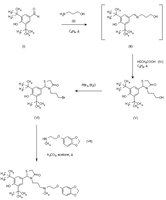 Aldehyde (I) was condensed with 3-aminopropanol (II) in refluxing benzene using a Dean-Stark trap to give imine (III) which, without purification, was in turn condensed with a-mercaptoacetic acid (IV) to afford thiazolidinone (V). Treatment of alcohol (V) with PBr3 gave bromide (VI). Then, reaction of (VI) with amine (VII) in the presence of K2CO3 in refluxing acetone produced the target compound.