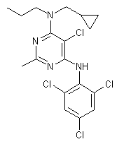 | 合成路线图解说明: The condensation of 4,6-dichloro-2-methylpyrimidine (I) with 2,4,6-trichloroaniline (II) by means of NaH in THF gives N-(6-chloro-2-methylpyrimidin-4-yl)-N-(2,4,6-trichlorophenyl)amine (III), which is condensed with N-(cyclopropylmethyl)-N-propylamine (IV) by heating at 100-190 C yielding N-(cyclopropylmethyl)-N-[2-methyl-6-(2,4,6-trichlorophenylamino)-pyrimidin-4-yl]-N-propylamine (V). Finally, this compound is chlorinated with N-chlorosuccinimide (NCS) in refluxing chloroform. |