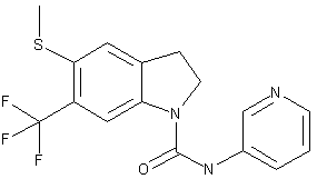 The reaction of 6-(trifluoromethyl)indoline (I) with potassium thiocyanate and Br2 in methanol gives 5-thiocyanato-6-(trifluoromethyl)indoline (II), which is treated with ammonia in hot dioxane/water yielding the disulfide (III). The acylation of (III) with acetic anhydride and triethylamine in dichloromethane affords the corresponding diacetyl derivative (IV), which is treated with triphenylphosphine and conc. HCl in refluxing dioxane to give 5-sulfanyl-6-(trifluoromethyl)-indoline (V). The methylation of (V) with methyl iodide and K2CO3 in hot DMF yields the methylsulfanyl compound (VI), which is deacetylated with NaOH in refluxing ethanol/water affording 5-(methylmsulfanyl)-6--(trifluoromethyl)-indoline (VII). Finally, this compound is condensed with 3-pyridyl isothiocyanate (VIII) in toluene. The indoline (VII) can also be obtained directly from indoline (I) by reaction of (I) with potassium thiocyanate and Br2 in methanol, followed by a treatment with methyl iodide and KOH. The 3-pyridyl isocyanate can be obtained by decomposition of pyridine-3-carboxylic acid azide (IX) in refluxing toluene.
