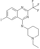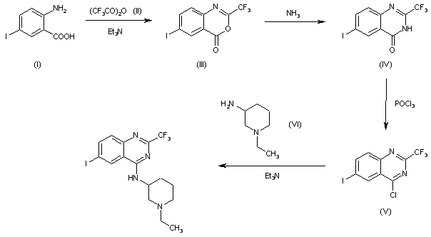 The cyclization of 2-amino-5-iodobenzoic acid (I) with an excess of refluxing trifluoroacetic anhydride (II) by means of triethylamine gives 6-iodo-2-(trifluoromethyl)-3,1-benzoxazin-4-one (III), which is treated with conc. aqueous NH4OH to afford 6-iodo-2-(trifluoromethyl)quinazolin-4(3H)-one (IV). The reaction of (IV) with refluxing POCl3 yields 4-chloro-6-iodo-2-(trifluoromethyl)quinazoline (V), which is finally condensed with 1-Ethylpiperidine-3-amine (VI) by means of triethylamine in ether.