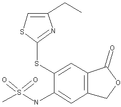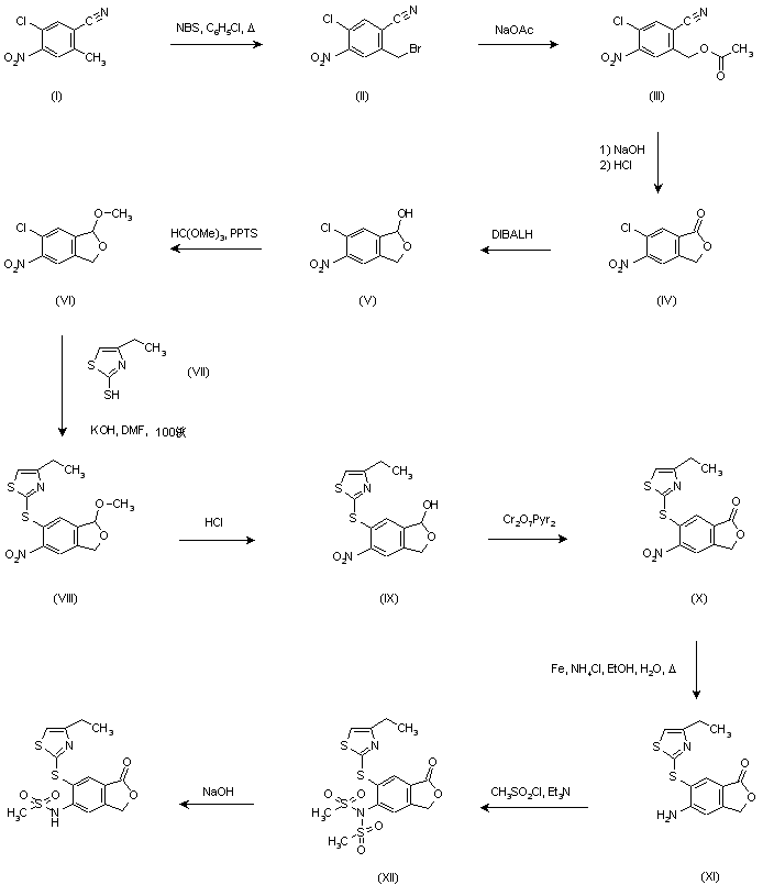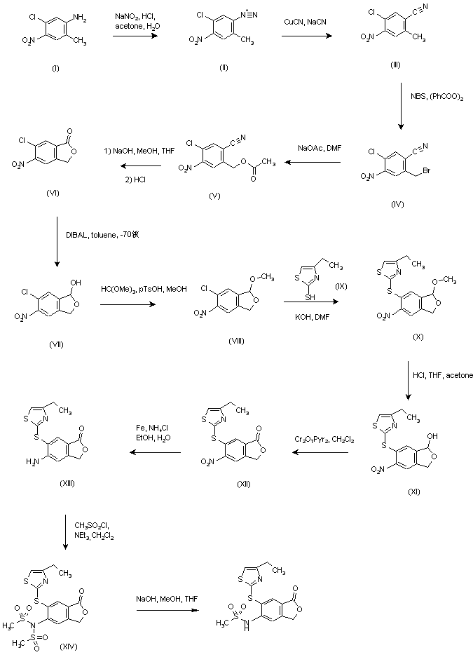 5-Chloro-4-nitro-2-methylaniline (I) was treated with NaNO2 and HCl, and to the intermediate diazonium salt (II) was treated with a mixture of NaCN and Cu2(CN)2 to afford nitrile (III). Benzylic bromination of III with N-bromosuccinimide (NBS) and a catalytic amount of benzoyl peroxide under light irradiation gave bromide (IV), which was converted into acetate (V) on reaction with sodium acetate in DMF. Basic hydrolysis of (V) with NaOH, followed by treatment with HCl, yielded isobenzofuranone (VI). Treatment with diisobutylaluminum hydride (Dibal) in toluene at -78 C effected partial reduction of lactone (VI) to the cyclic hemiacetal (VII), which was then converted into methyl acetal (VIII) by treatment with methanol and trimethyl orthoformate in the presence of p-toluenesulfonic acid. Further reaction with 2-mercapto-4-ethylthiazole (IX) and KOH in DMF provided thiazolyl thioether (X). Then, the methylacetal group was hydrolyzed with HCl in THF-acetone, and the resulting hemiacetal (XI) was oxidized with pyridinium dichromate in dichlorometane to the isobenzofuranone (XII). Reduction of the nitro group with iron powder and ammonium chloride in refluxing EtOH-H2O afforded aniline (XIII). This was condensed with mesyl chloride in the presence of triethylamine to give the bis(methanesulfonyl) compound (XIV), which was finally hydrolyzed with NaOH to the title sulfonamide.