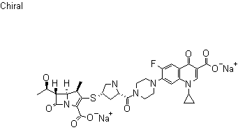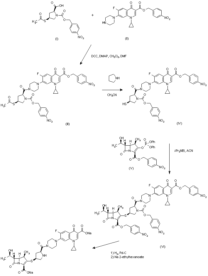 Coupling of thioacetylproline derivative (I) with p-nitrobenzyl ester of ciprofloxacin (II) in the presence of dicyclohexylcarbodiimide (DCC) and 4-dimethylaminopyridine (DMAP) provided amide (III). Treatment with pyrrolidine in acetonitrile gave thiol (IV), which was subsequently alkylated with the carbapenem phosphate (V) in the presence of diisopropylethylamine to give thioether (VI). Then, hydrogenolytical removal of p-nitrobenzyl protecting groups in the presence of Pd-C, followed by treatment with sodium 2-ethylhexanoate in acetone provided the target disodium salt.
