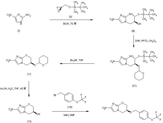 | 合成路线图解说明: Condensation of 2,4-dinitroimidazole (I) with the silyl-protected (S)-glycidol (II) gave the N-substituted imidazole (III). The free hydroxyl group of (III) was then protected as the tetrahydropyranyl ether (IV) by treatment with dihydropyran and pyridinium tosylate. Desilylation of (IV) by means of tetrabutylammonium fluoride proceeded with concomitant nitro group displacement to afford the pyranoimidazole derivative (V). The tetrahydropyranyl group of (V) was then removed by acidic hydrolysis to provide alcohol (VI). Finally, condensation of (VI) with 4-(trifluoromethoxy)benzyl bromide (VII) under Williamson's ether synthesis conditions provided the title compound. |