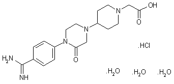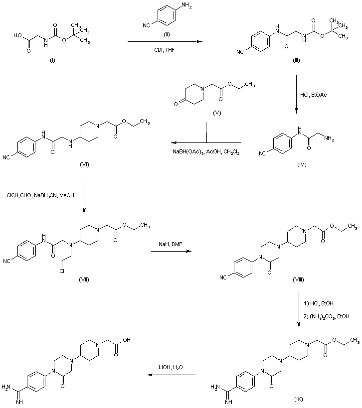 Coupling between N-Boc-glycine (I) and 4-aminobenzonitrile (II) via activation with CDI yields amide (III). Subsequent acidic N-Boc group cleavage provides the amino acetanilide (IV). Reductive alkylation of amine (IV) with ethyl 4-oxopiperidine-1-acetate (V) leads to the aminopiperidine (VI). This is reductively alkylated with chloroacetaldehyde in the presence of NaBH3CN, to produce the chloroethyl amine (VII). Cyclization of (VII) by means of NaH in DMF furnishes the piperazinone (VIII). The cyano group of (VIII) is then converted to the corresponding ethyl imidate, which is further displaced with ammonium carbonate producing amidine (IX). Finally, saponification of the ethyl ester group of (IX) with LiOH gives rise to the title amidino acid
