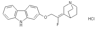 The Horner-Emmons condensation of 3-quinuclidinone (I) with triethyl 2-fluoro-2-phosphonoacetate (II) produced the unsaturated ester (III). The amino-borane complex (IV) was then obtained by treatment of (III) with borane in THF. Ester group of (IV) reduction by means of sodium bis(2-methoxyethoxy)aluminium hydride gave the allylic alcohol (V), which was converted into chloride (VI) by treatment with mesyl chloride in the presence of LiCl. Condensation of chloride (VI) with 2-hydroxycarbazole (VII) yielded ether (VIII). After acid cleavage of the amino-borane complex (VIII), the title compound was isolated as the hydrochloride salt.